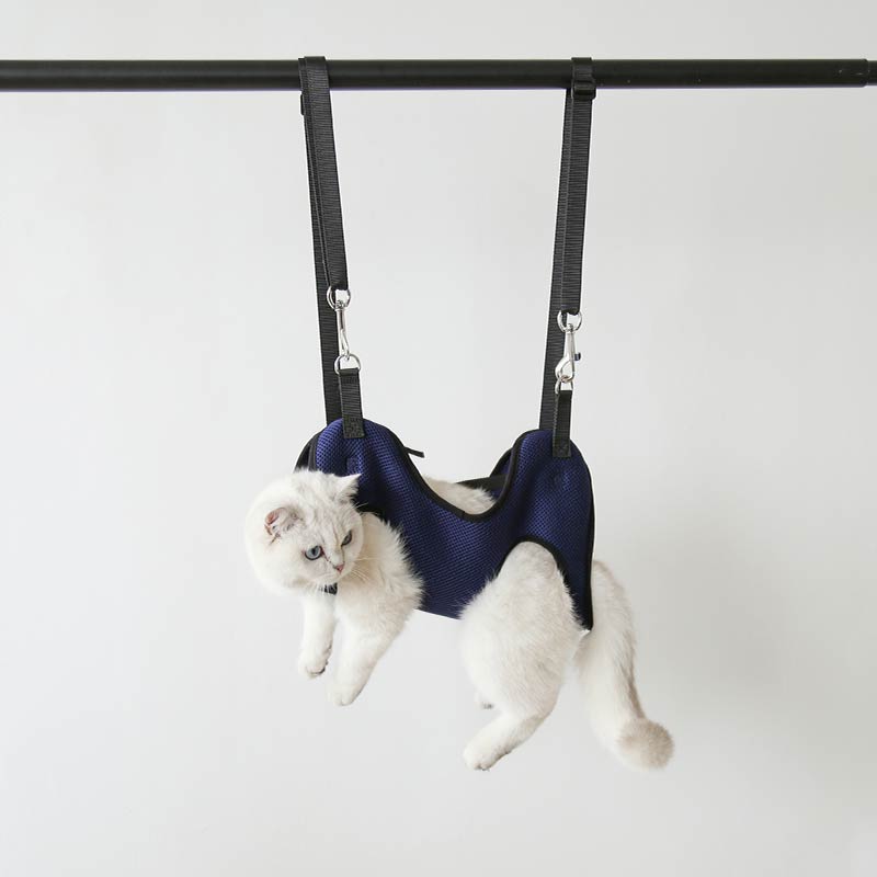 Le Hamac de Toilettage GrosMatou utilise la technique de la "Contention Douce". En étant suspendu confortablement, votre chat se sent soutenu mais ne peut plus gigoter. Il se calme instantanément, vous laissant les deux mains libres pour travailler.